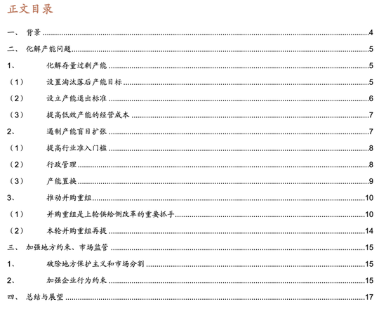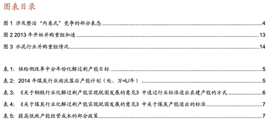 化解产能问题主要有三种方式:一是化解存量过剩产能,此前产能过剩主要集中在钢铁、煤炭等行业,主要通过三种方式化解:1)设置淘汰落后产能目标,通过分年度、分地区设定具体去产能目标,推动落后产能逐步退出;2)设立产能退出标准,通过制定环保、能耗、安全、质量、技术等五方面主要退出标准,倒逼不具备合格竞争力的企业依法退出;3)提高低效产能的经营成本,通过降低或取消出口退税率、提高产能过剩行业电价、限制信贷融资支持等手段,抬高低效产能经营成本。二是遏制产能盲目扩张,主要通过三种方式实现:1)提高行业准入门槛,通过设置硬性技术、环保、能耗、安全等标准,推动企业技术升级改造;2)政府行政管理,通过投资审查、项目备案等方式直接控制新增产能;3)产能置换,新建或改造产能必须通过等量或减量置换方式来淘汰落后产能。三是推动并购重组,政策支持力度自2010年起持续加码,明确将其作为化解过剩产能的重要手段。通过发布《关于加快推进重点行业企业兼并重组的指导意见》、《关于化解产能严重过剩矛盾的指导意见》、《上市公司重大资产重组办法》等一系列政策文件,为并购重组化解过剩产能加速,鼓励钢铁、水泥等行业加快整合。