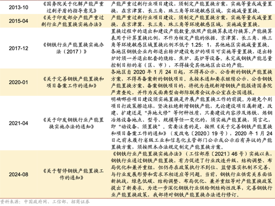 自2013年以来,钢铁产能置换政策不断优化,目前正在进行新一轮的修订。2024年8月工信部发布《关于暂停钢铁产能置换工作的通知》,要求各地区自2024年8月23日起,暂停公示、公告新的钢铁产能置换方案。在此之前的2020年也曾出现过暂停公示和公告新的钢铁产能置换方案,不再备案新的钢铁项目,并同步修订产能置换办法,在暂停15个月后发布了新版本的产能置换办法。