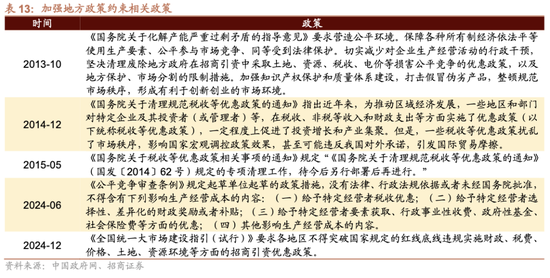 2024年6月,《公平竞争审查条例》规定没有法律、行政法规依据或者未经国务院批准,不允许1)给予特定经营者税收优惠;2)给予特定经营者选择性、差异化的财政奖励或者补贴;3)给予特定经营者要素获取、行政事业性收费、政府性基金、社会保险费等方面的优惠;4)其他影响生产经营成本的内容。随后《全国统一大市场建设指引(试行)》,要求各地区不得突破国家规定的红线底线违规实施财政、税费、价格、土地、资源环境等方面的招商引资优惠政策,并针对地方保护和市场分割屡禁不止、花样翻新等情况,集中力量开展攻坚整治。