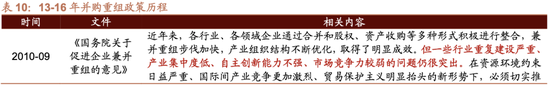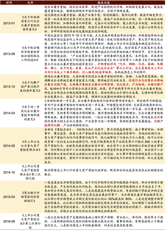 并购重组是上轮供给侧改革的重要抓手。具体来看,从2010年首个高级别支持并购重组的意见出台开始,支持化解过剩产能就已成为并购重组的一大主要目的。2010年出台的《国务院关于促进企业兼并重组的意见》将“一些行业重复建设严重”列为促进并购重组的主要原因。2013年,并购重组加快。专项文件《关于加快推进重点行业企业兼并重组的指导意见》的出台,明确表示支持9大行业并购重组,其中钢铁、水泥、电解铝等行业的支持细则明确表态,通过并购重组化解过剩产能。2013年出台的化解过剩产能的专项文件,即《关于化解产能严重过剩矛盾的指导意见》,将并购重组列为化解产能过剩的主要方式等。2014年《关于进一步优化企业兼并重组市场环境的意见》出台,并购重组要求进一步放宽,《上市公司重大资产重组管理办法》第二次修订版取消了除借壳上市以外的重大资产重组行政审批、取消部分向证监会及其派出机构报告的要求,并购重组进一步加速。直到2016年《上市公司重大资产重组办法》第三次修订版印发,才开始逐渐减速。