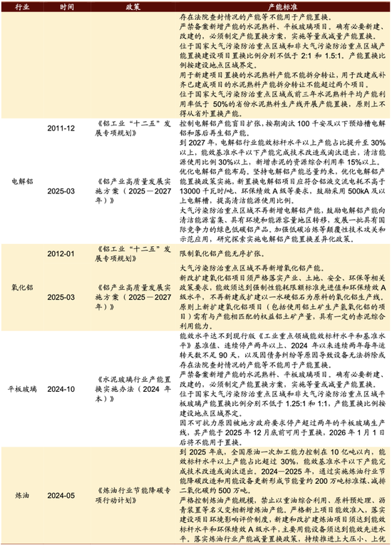 化解产能结构性问题的另一大手段遏制产能盲目扩张:从历史经验来看,可通过1)通过设置硬性技术、环保、能耗、安全等标准,提高行业准入门槛;2)通过投资审查、项目备案等政府行政管理方式控制新增产能;3)产能置换,要求新建或改造产能通过等量或减量置换方式来淘汰落后产能同时控制新增产能。