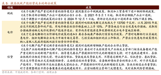 举例来看,提高低效产能的经营成本政策主要有三类:(1)税收相关,如降低或取消出口退税率、取消加工贸易项下的进口保税政策等;(2)电价相关,如禁止对某一产能过剩行业出台优惠电价政策、组织电力市场专场交易等;(3)信贷相关,如对产能过剩行业停止提供新增授信支持、压缩退出存量贷款等。