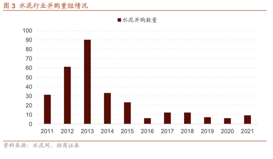 从政策效果来看,以水泥为例,水泥并购重组数量在2013年达到高点。具体来看,《关于加快推进重点行业企业兼并重组的指导意见》提出“到2015年,前10家水泥企业产业集中度达到35%,形成3-4家熟料产能1亿吨以上,矿山、骨料、商品混凝土、水泥基材料制品等产业链完整,核心竞争力和国际影响力强的建材企业集团”的目标。从并购重组数量上,水泥行业并购重组在2011-2015年间经历了一波热潮,在2013年达到顶峰。在水泥行业并购高峰期间,西南地区最为典型。由于彼时西南地区出现了一大批水泥企业,但由于水泥企业规模小,技术含量低,产能过剩等因素影响,导致整个西南地区水泥企业无序竞争现象非常严重。中国建材便在此期间强势发力,对大量落后的中小水泥企业进行联合重组,并于2011年成立了西南水泥有限公司,到了2012年西南水泥年产能达1.5亿吨。