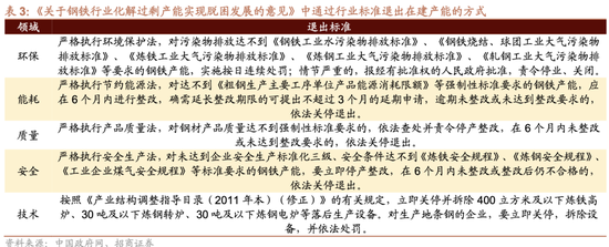 举例来看,在此前供给侧改革中,《关于钢铁行业化解过剩产能实现脱困发展的意见》规定了钢铁行业通过行业标准退出在建产能的方式,主要涉及了环保、能耗、质量、安全、技术这五个方面。对无法达到这五个方面的主要行业标准,且通过停产整改后仍不合格的企业进行依法关停退出、处罚等措施。